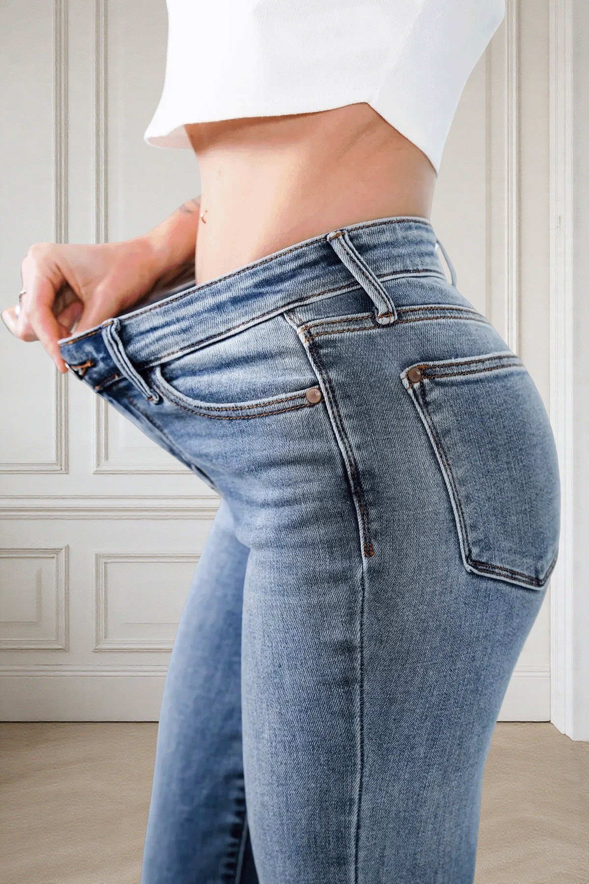 Crafted with premium stretch fabric, these jeans offer unparalleled comfort without losing their shape. They hug your hips, lift your booty, and bounce back to their original fit, ensuring you look and feel amazing all day long. The mid-rise waist hits just the right spot, providing a snug yet comfortable fit that moves with you.