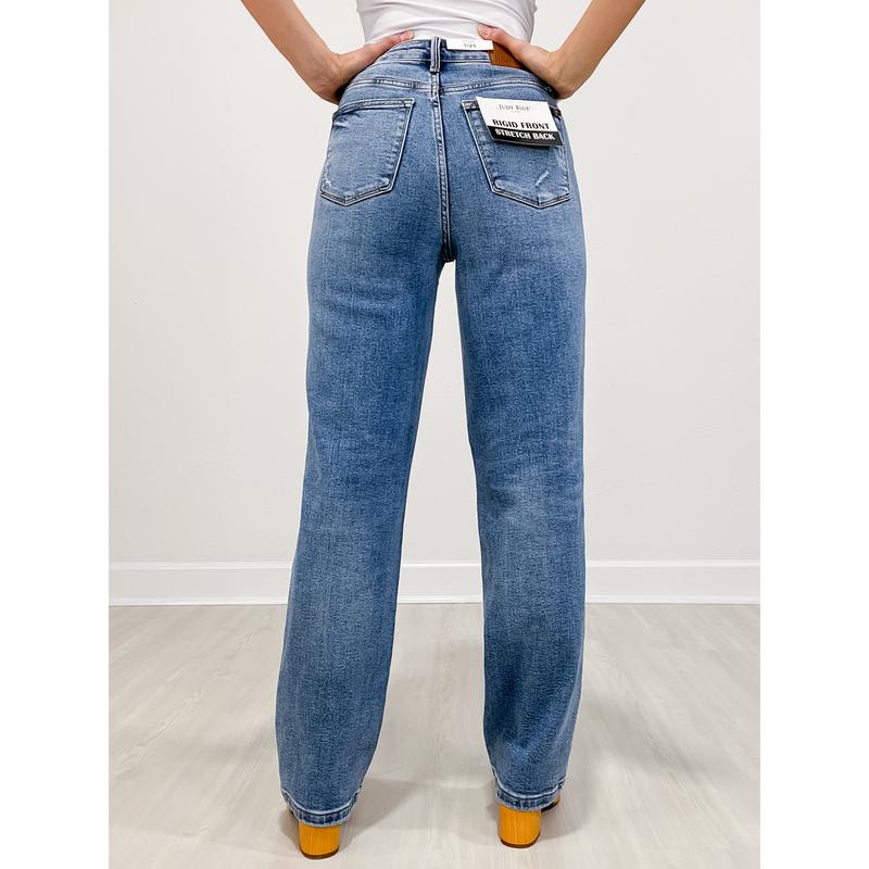Judy HERE TO STAY Hi-Rise Criss Cross Waistband Rigid Magic Distressed Dad Jean