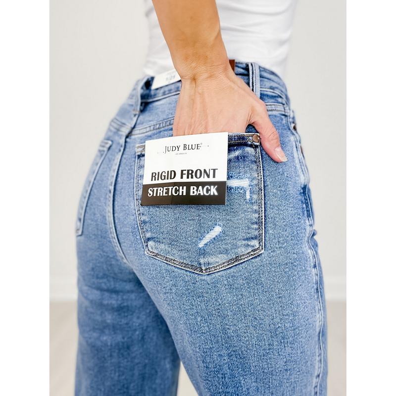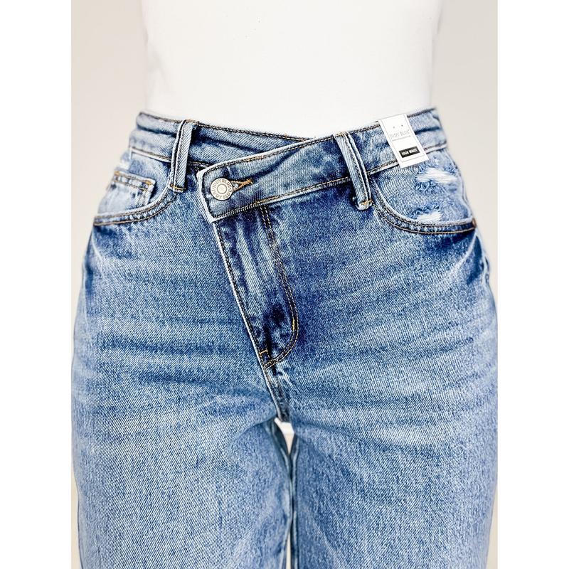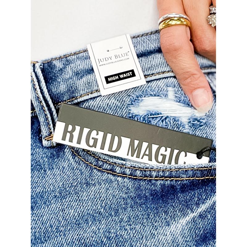 • Judy HERE TO STAY Hi-Rise Criss Cross Waistband Rigid Magic Distressed Dad Jean