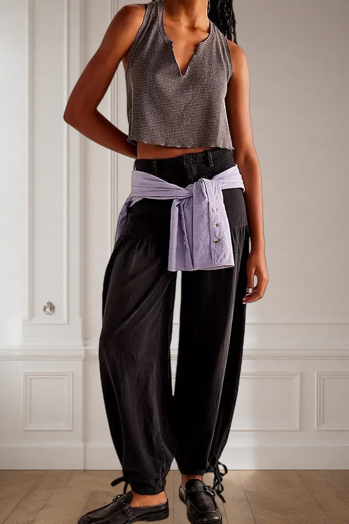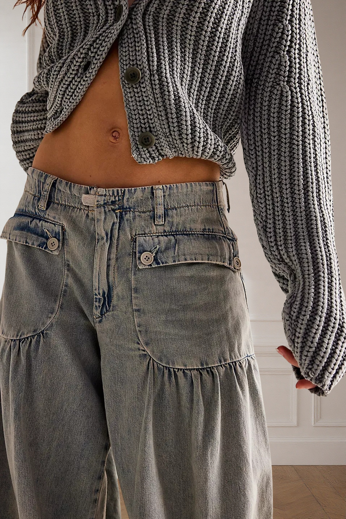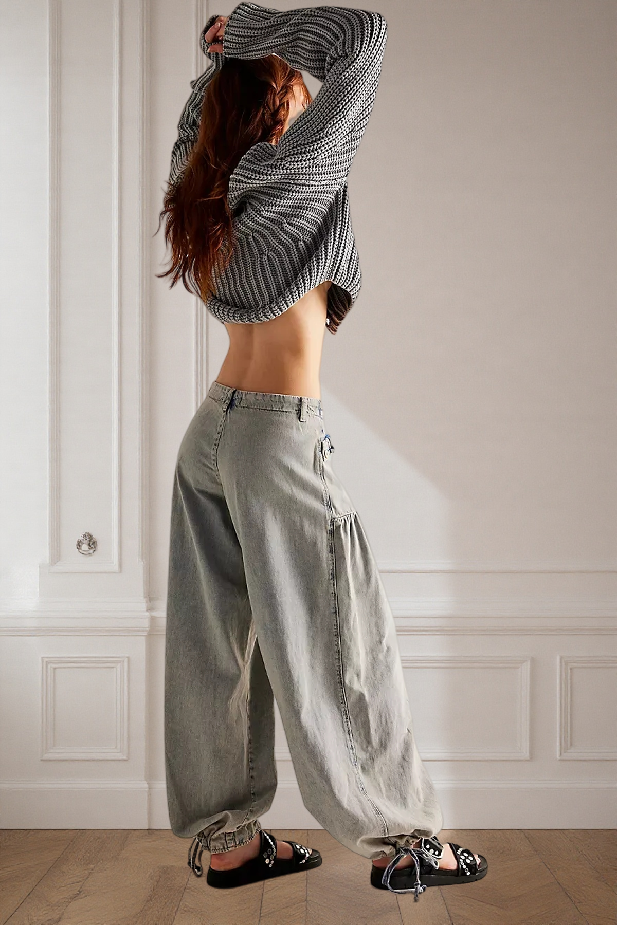 Discover the perfect blend of comfort and style with Lotus Tube Jeans. Crafted from soft, stretch denim, these jeans feature a balloon-style silhouette with dropped front pockets and cinch-tie banded ankles for a playful, dimensional look. The mid-rise design and femme pleating throughout add a touch of elegance, while the zip-fly with hook-and-bar closure ensures a snug, secure fit.