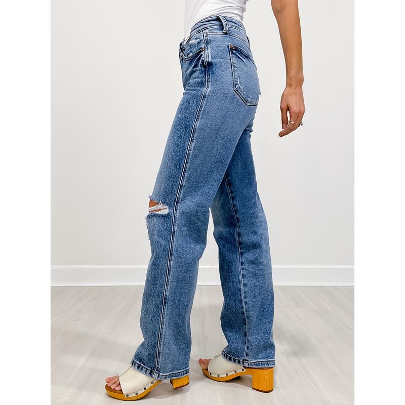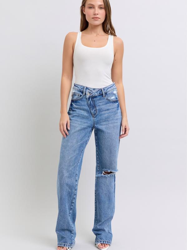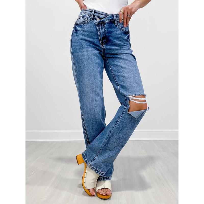 Judy HERE TO STAY Hi-Rise Criss Cross Waistband Rigid Magic Distressed Dad Jean