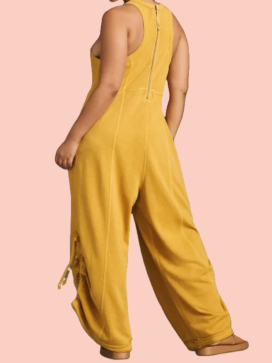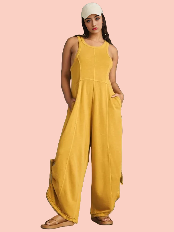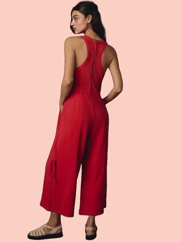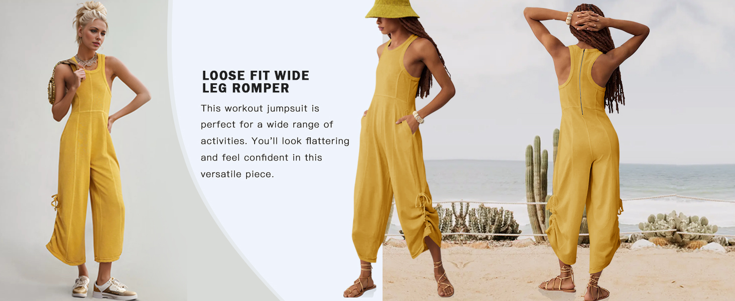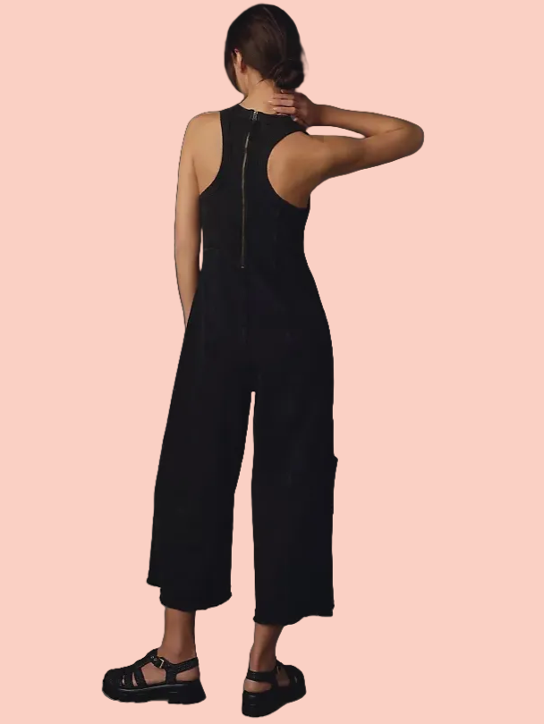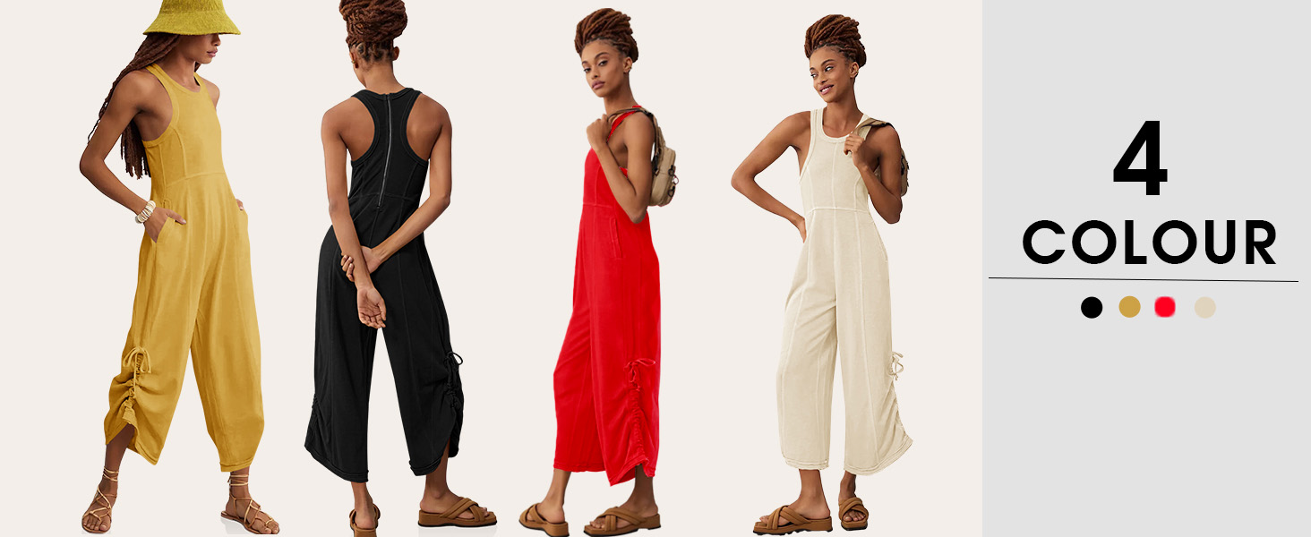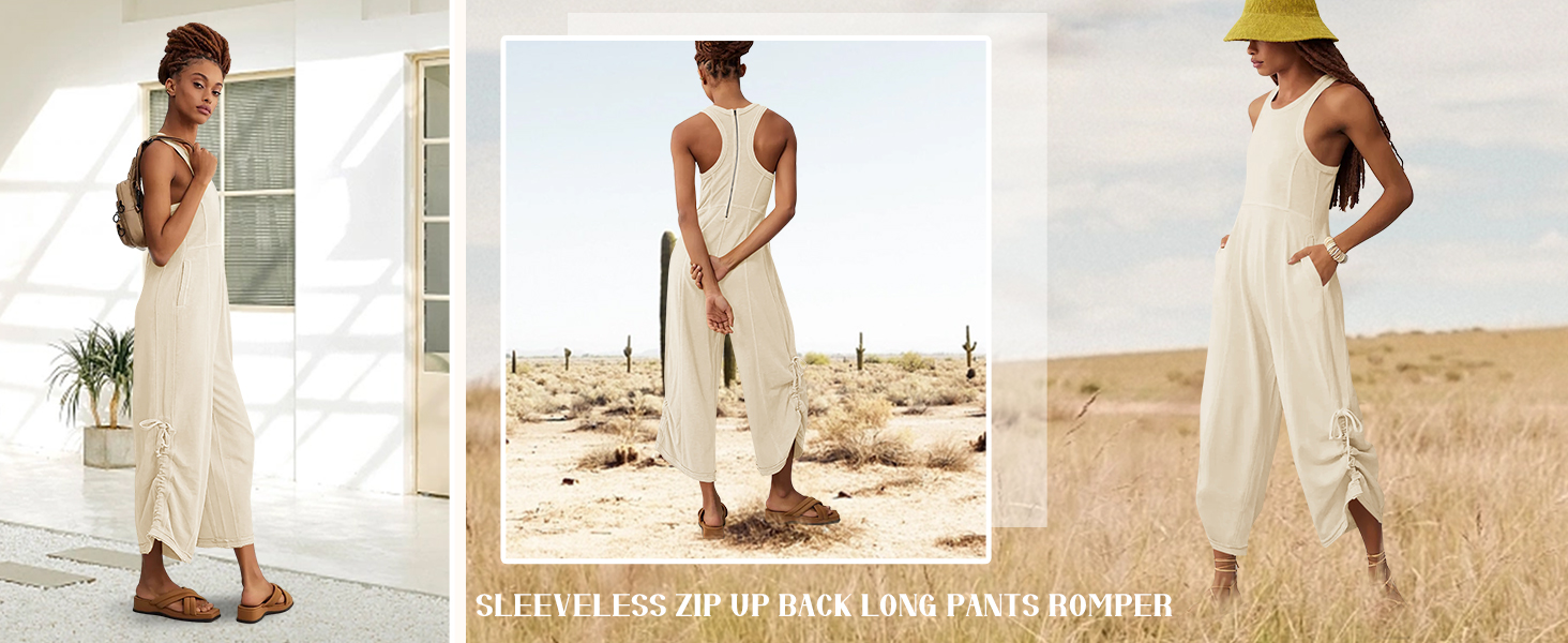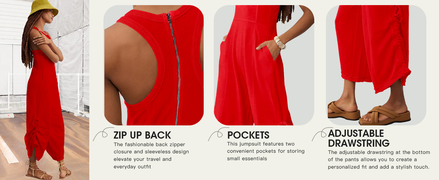 Trendy back zipper closure, sleeveless design, wide leg pants, two pockets, and a flattering loose fit.