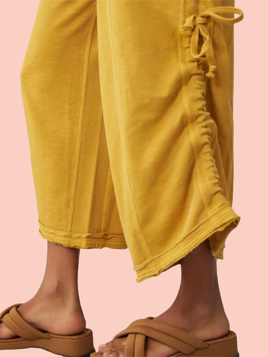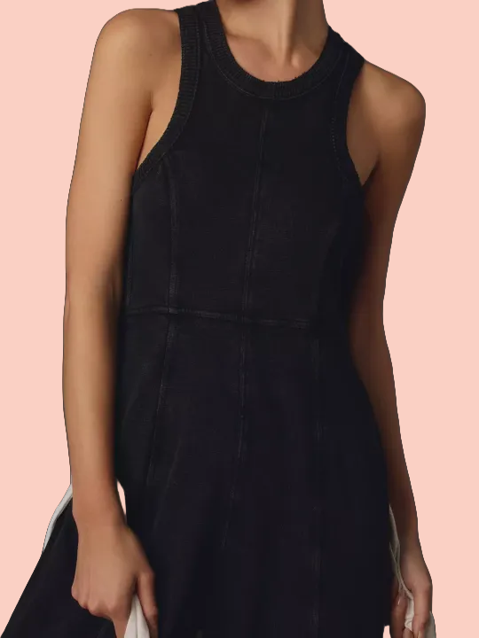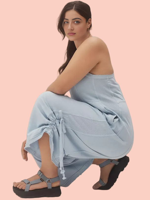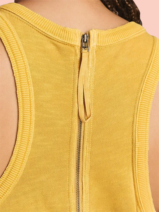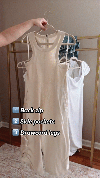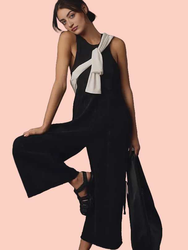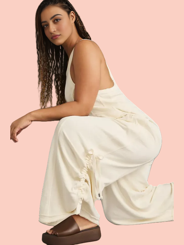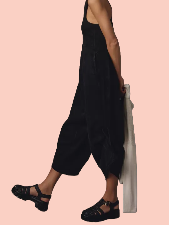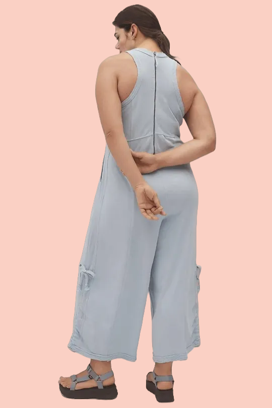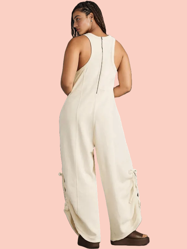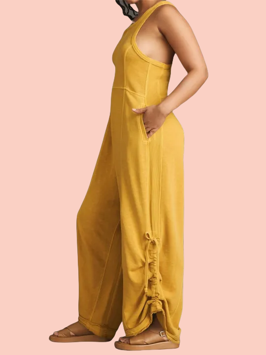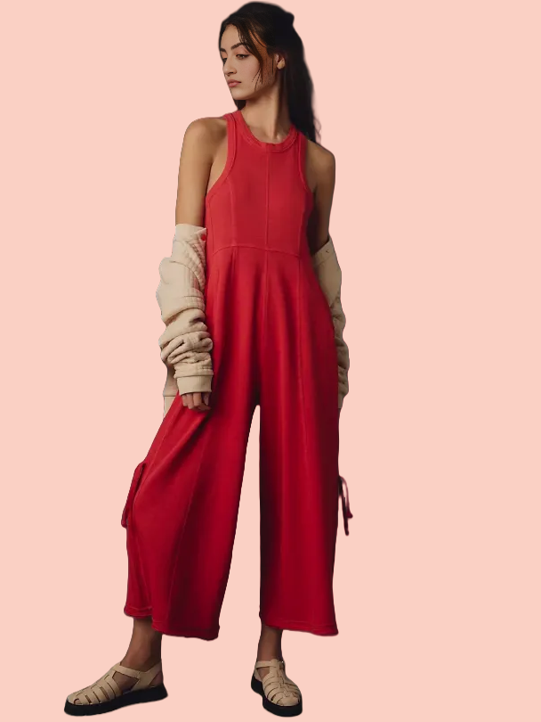 Trendy back zipper closure, sleeveless design, wide leg pants, two pockets, and a flattering loose fit.