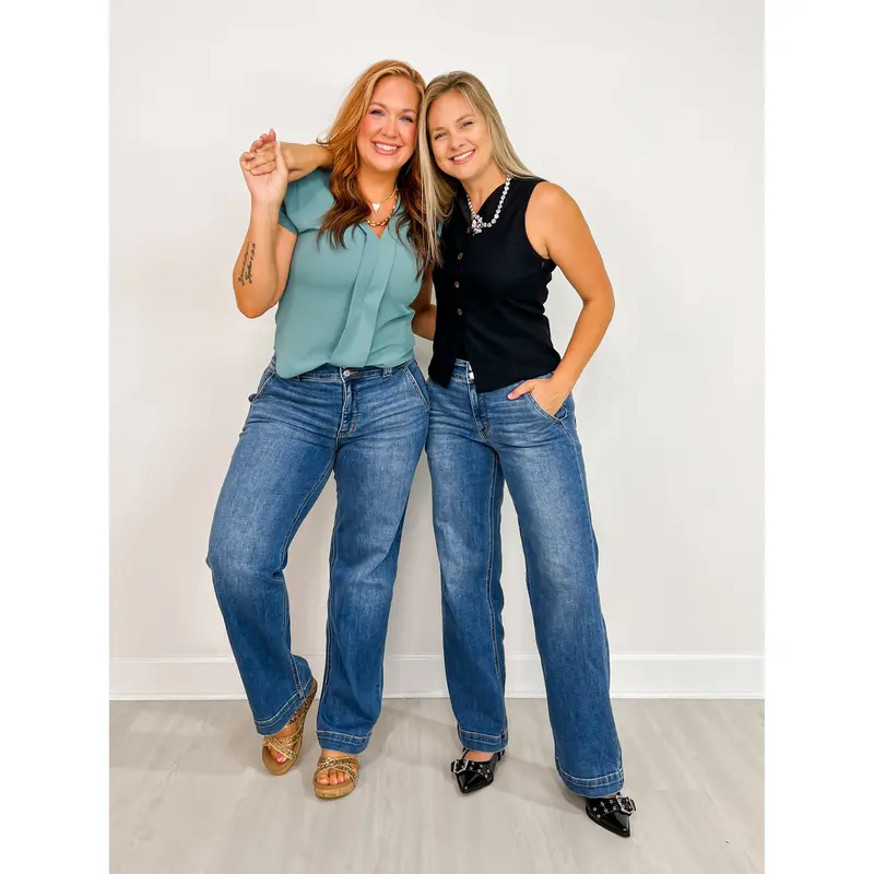 Check out the Judy Blue DOUBLE DOWN High Waist Double Button Wide Leg Jeans! These jeans are all about style and comfort. With a high waist and a cool double button closure, they look great on everyone. The wideleg fit is super relaxed, making them perfect for both casual wear and a bit of dressing up. Plus, the soft,stretchy denim keeps you comfy all day long. Whether you're going for a laid-back vibe or something a little fancier, these jeans have got you covered!