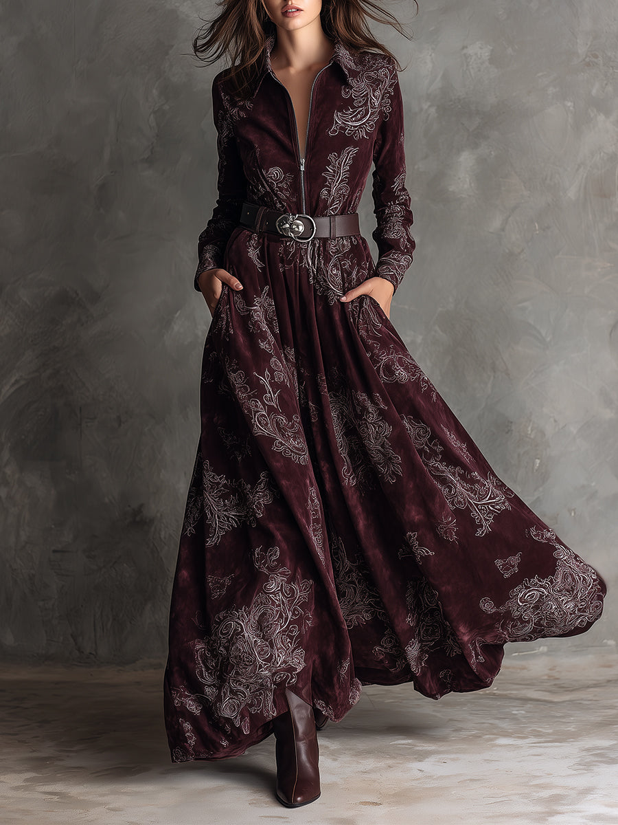 Bohemian Velvet Embroidered Borders Maxi Dress