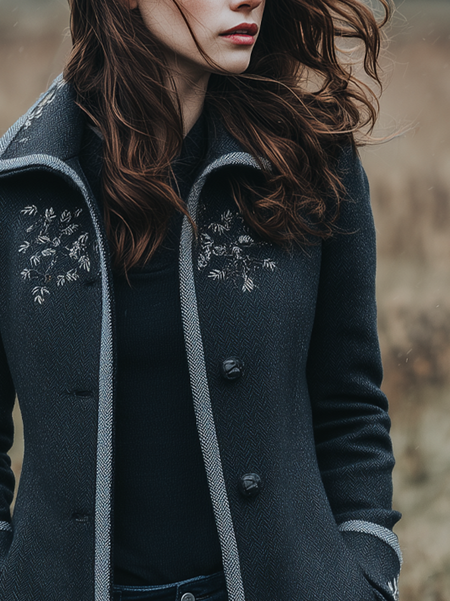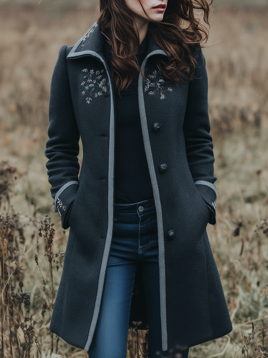Retro Contrast Trim Floral Embroidery Woolen Polyester Mid-length Jacket
