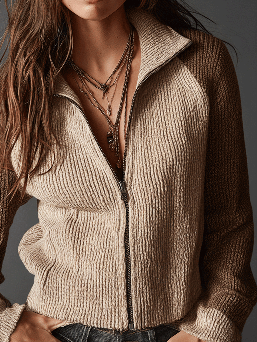Relaxed Chic Soft Two-Tone Knit Zip Cardigan