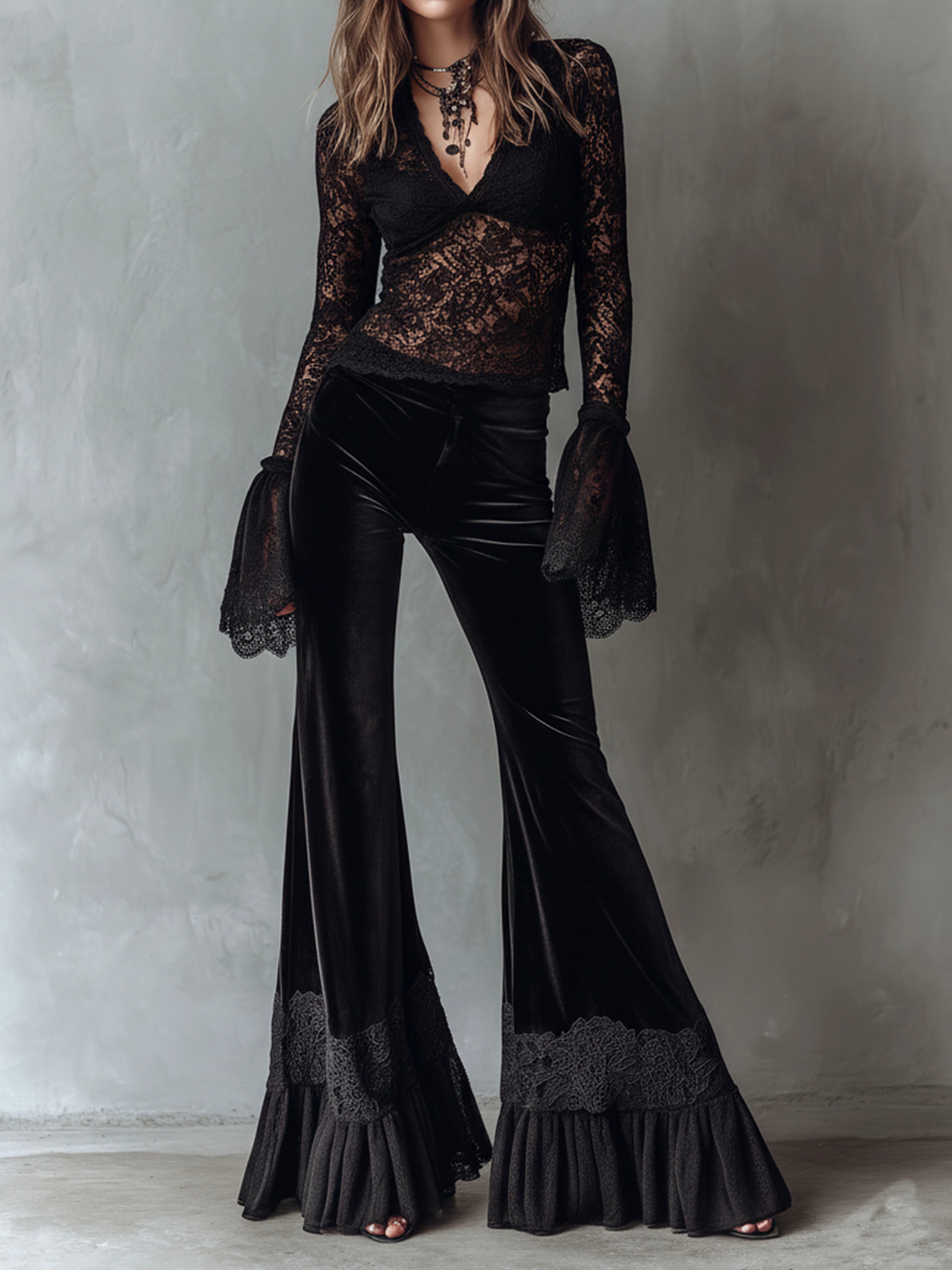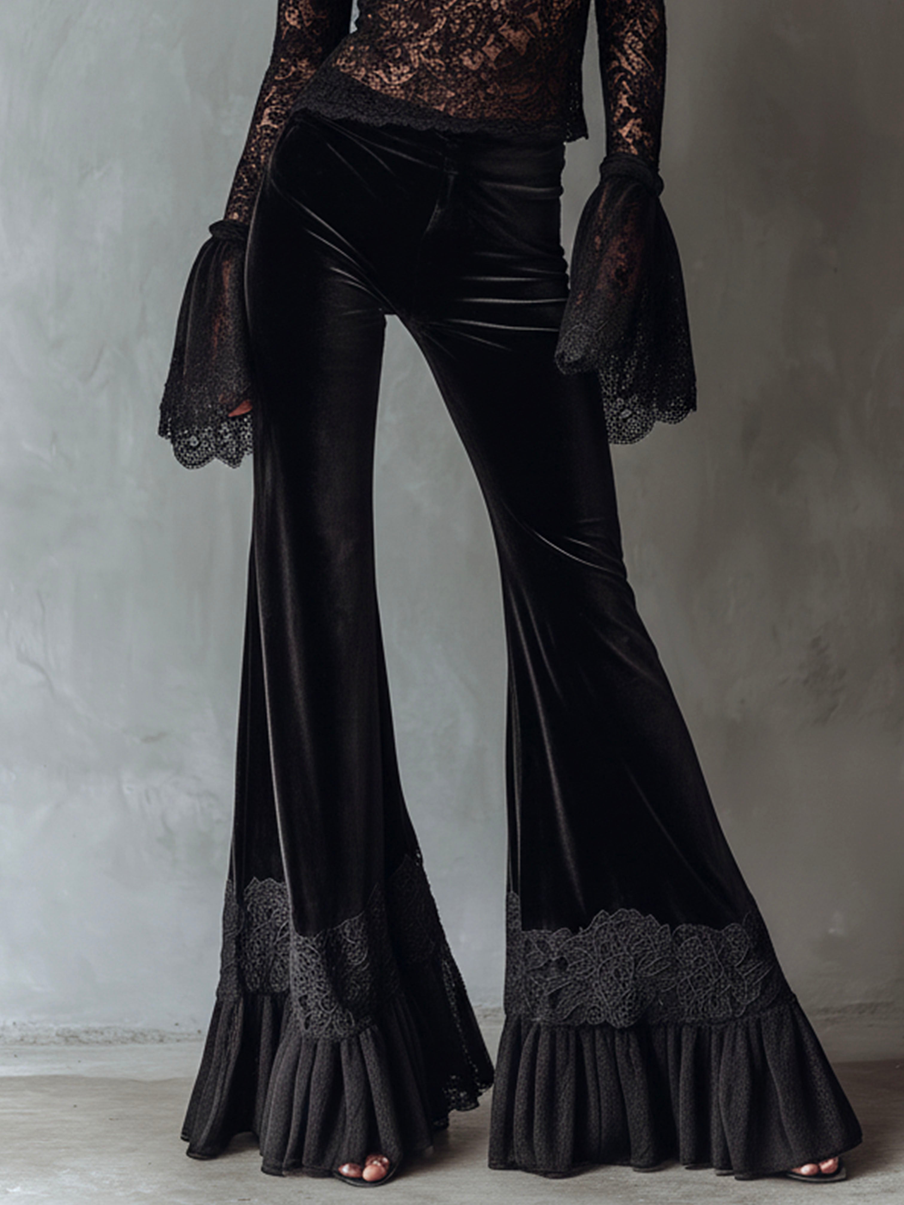 Chic Boho Black Velvet Lace Trim Flared Pants