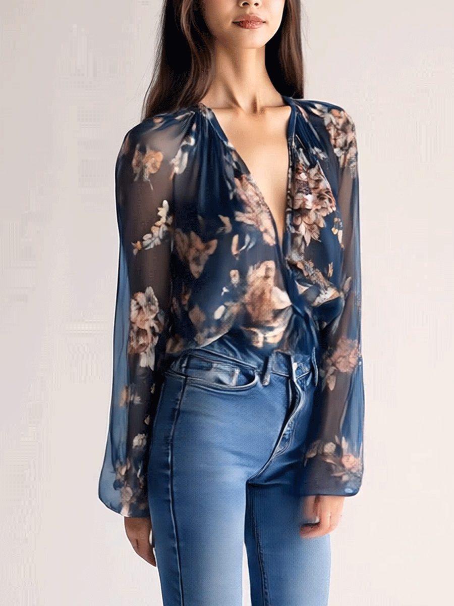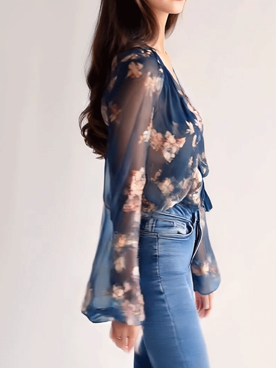 Introduction:Embrace a world of elegance with our Whispering Petals sheer floral blouse. With its lightweight navy fabric and enchanting floral design, this blouse offers an ethereal charm perfect for brunches or evening gatherings. The deep V-neckline and flared sleeves add a touch of modern femininity. Preserve its delicate beauty with a gentle cycle or hand wash.