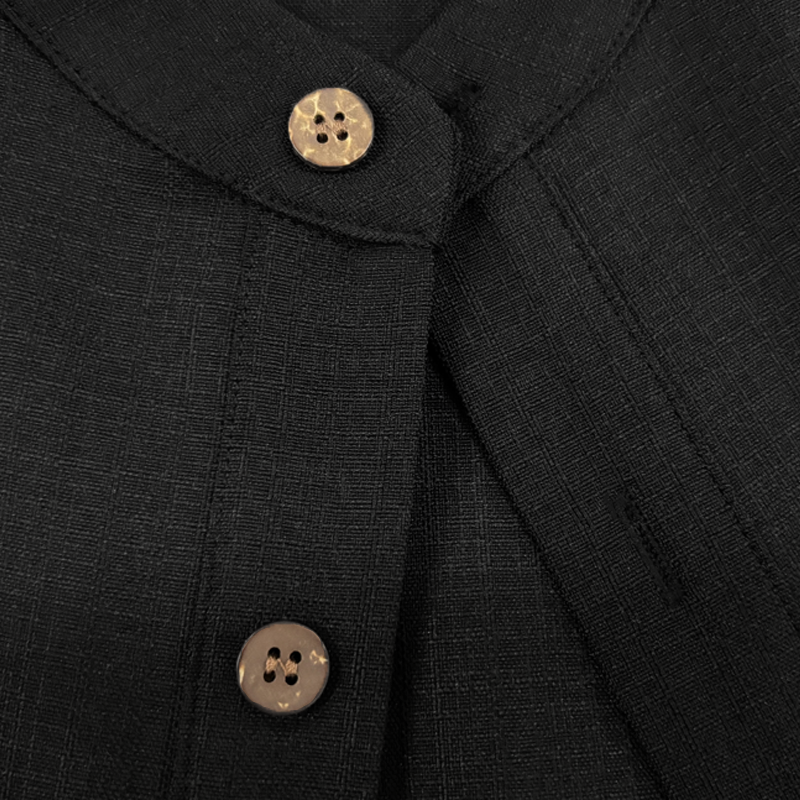 A front button placket allows for easy wearing and adjusting, while matching buttons enhance the shirt’s sleek look.