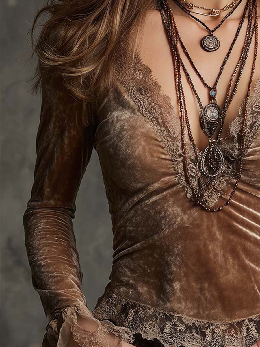 Vintage Light Brown Velvet Lace Trim Long Sleeve Top