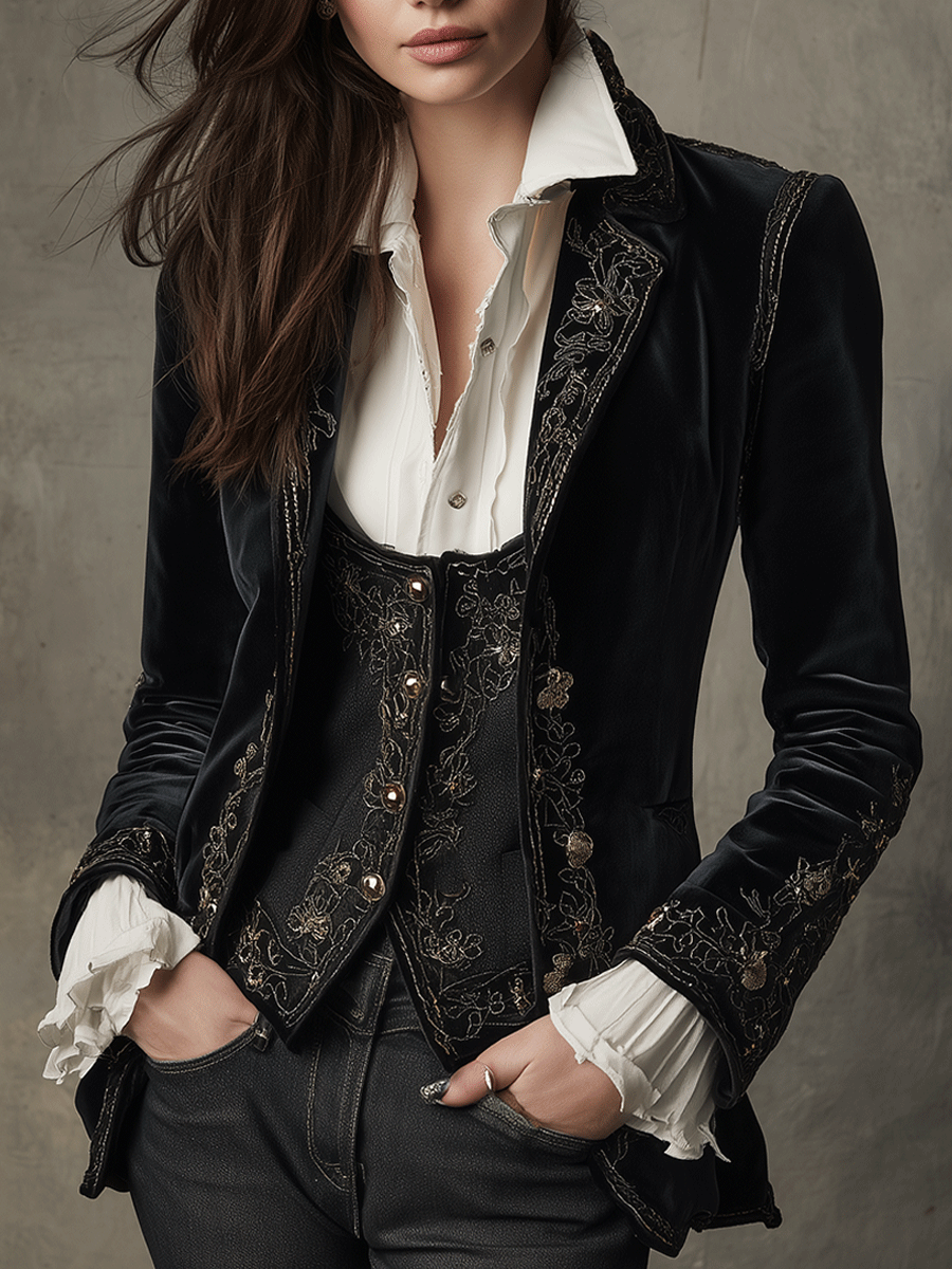 Black Velvet Embroidered Lapel Victorian Blazer Jacket