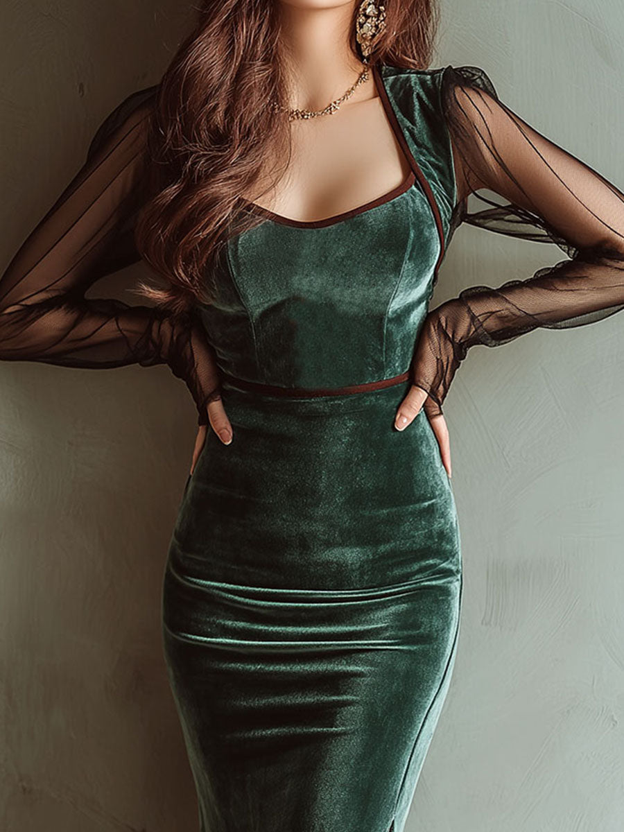 Emerald Velvet Sheer Mesh Sleeves Bodycon Midi Dress With Side Slit