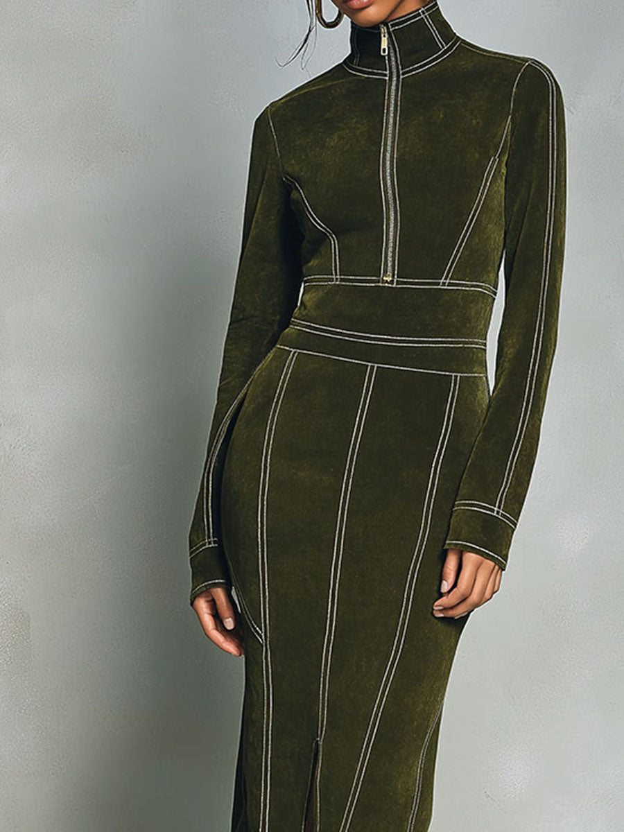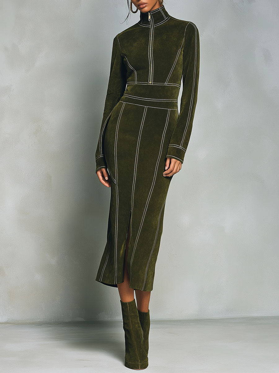 High Neck Zip-Up Olive Green Midi Dress With Contrast Stitching