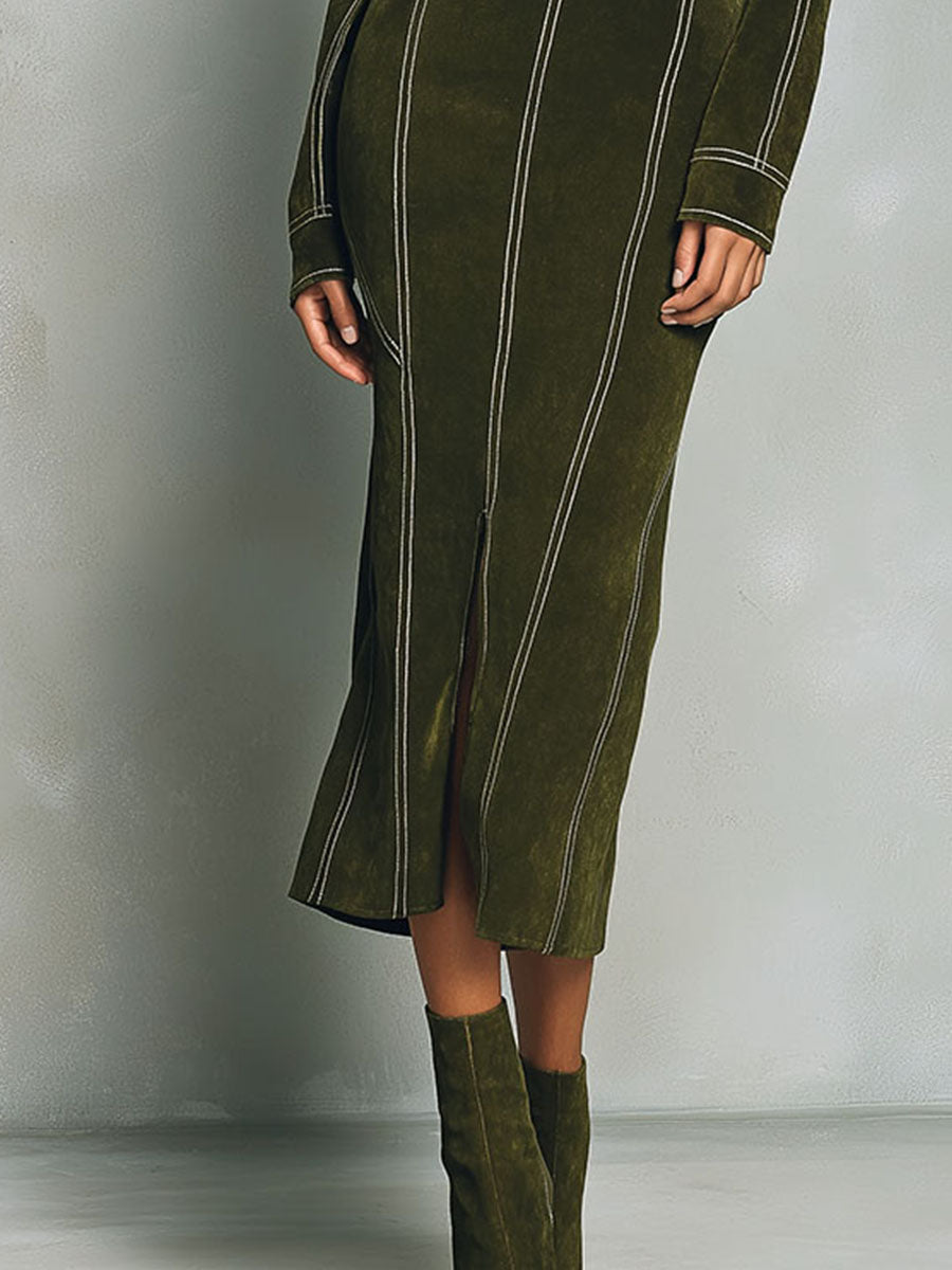 The High Neck Zip-Up Olive Green Midi Bodycon Dress with Contrast Stitching is a stunning addition to any wardrobe. This dress combines a modern silhouette with classic detailing, making it perfect for a range of occasions, from casual outings to semi-formal events.