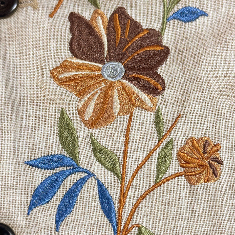Crafted from high-quality linen, this jacket offers exceptional breathability and lightness. The natural fibers keep you cool and comfortable, making it an ideal choice for warm-weather wear.Intricate Embroidery: